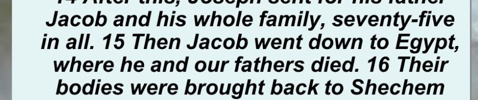 Then Joseph sent for his father Jacob, inviting him and his whole clan, seventy-five persons; and Jacob went down to Egypt. And he and our ancestors died and were brought back to Shechem and placed in the tomb that Abraham had purchased for a sum of money from the sons of Hamor at Shechem. Acts 7:14-16